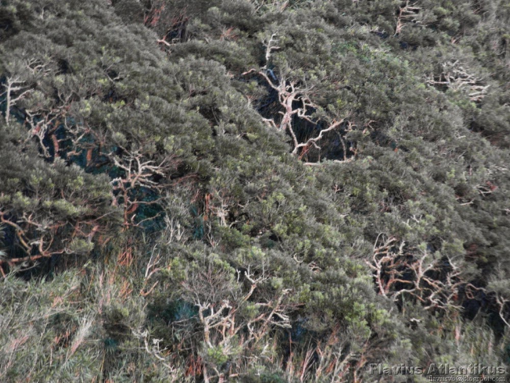 ilha, contrastando entre si e com o verde arbustivo, canavial ou de mata baixa de faias e outras.